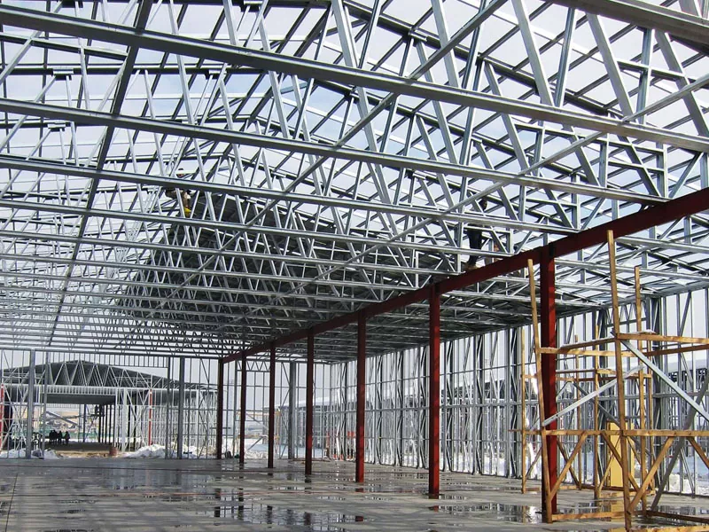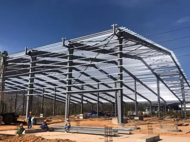 די פּריפאַבריקייטיד שטאָל קאַמפּאָונאַנץ זענען טראַנספּאָרטאַד צו די קאַנסטראַקשאַן פּלאַץ און פארזאמלט מיט קריינז און אנדערע שווער עקוויפּמענט. די ינסטאַלירונג פּראָצעס טיפּיקלי הייבט מיט ירעקטינג און אַנגקערינג די שפאלטן צו דער יסוד. בימז זענען אינסטאַלירן צו פאַרבינדן די שפאלטן, פאָרמינג די ראַם פון די ווערכאַוס. דאַך טראַסיז זענען ערעקטעד און סיקיורד צו די ראַם, שטיצן די רופינג סיסטעם. דעם מעטהאָליקאַל פֿאַרזאַמלונג פּראָצעס ינשורז די סטראַקטשעראַל אָרנטלעכקייַט און פעסטקייַט פון דעם בנין.